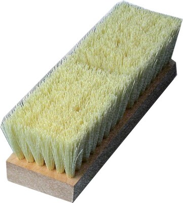 O'Dell® Deck brush in cream color offers a 10" long hardwood block with tapered and threaded handle holes for grip and easy hanging. Brush can be used for any general purpose scrubbing and is not affected by solvents or acids.