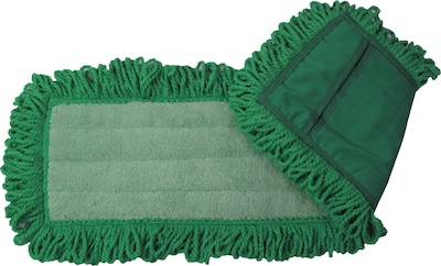 O'Dell® Microfiber dry dust mop pad in green color measuring 60" x 5" is made of microfiber and acts as standard dust mops. Mop pad lasts hundreds of launderings and fits standard dust mop wire frames/clip-on handles.