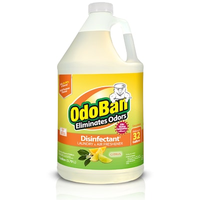 OdoBan multi-purpose concentrate formula does the job of many products in one. Our one-gallon bottle of concentrate makes up to 32 gallons of cleaner and is great to have on hand for refills when you need them. It's an effective cleaner and sanitizer that leaves no residue, and works effortlessly to disinfect hard, nonporous household surfaces. Kills the Human Coronavirus in 60 seconds when used according to disinfection directions on hard, nonporous surfaces; meets the criteria for inclusion on EPA List N. It's also an effective eliminator of harsh aromas and stenches including pet urine aftermath in carpet, upholstery, and more. It can even stand up to the smell of smoke and can be used in sinks, tubs, and for mopping floors and washing walls. Not only is it an exceptional cleaner, but it's a great air freshener and will remove harsh smells from any room. It's also a great way to refresh laundry and fabrics. OdoBan products can be used in both households and business facilities of all types including schools and day cares, hospitals, nursing homes, in ambulances, buses, and trains, in airplanes and taxis, in restaurants and cafeterias; pretty much any place where people commune. When used as directed, OdoBan is safe for use on washable surfaces, including sealed natural stone, stainless steel, ceramic, tile, Formica, fiberglass, rubber, vinyl, terrazzo, and plastic. Safe for use on sealed natural stone countertops and surfaces, like granite, quartz, marble, ceramic, and soapstone. Make Life Fresh with OdoBan.