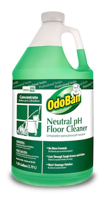 Protect high-traffic areas and more in your home or place of business with the OdoBan Professional Series Neutral pH No Rinse Floor Cleaner Concentrate. Our effective formula is streak free, leaves no residue, and has a refreshing and invigorating, yet light citrus scent. It can be used on a multitude of floors including sealed woods, laminates, tiles, asphalt tile, rubber, sealed concreate and more as well as other surfaces including toilets and sinks, glass, and even countertops. It is not recommended for unfinished wood or oiled wood. The neutral pH formula is harmless to finishes and does not leave a sticky residue behind. Each gallon of concentrate makes up to 128 of cleaning solution. Make Life Fresh with OdoBan.