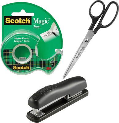 - Includes 1 Westcott Contract 7" scissor, 1 Quill Brand desktop stapler, and 1 refillable Scotch Magic tape dispenser with a roll of tape