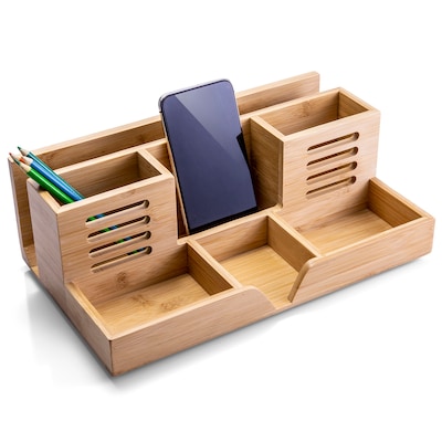 For a workspace organization solution that is both eco-friendly and stylish, look no further than Officemate's Bamboo products. Not only is Bamboo longer-lasting and stronger than common types of wood such as Oak and Maple, but it is also highly renewable, biodegradable, and carbon-negative. Natural, simplistic, and Modern design to match a variety of settings and decorations Features 7 storage compartments to be able to organize a variety of multiple- sized items. Bamboo material allows for strength and durability