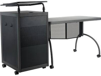 The teacher's WorkPod desk and lectern from Oklahoma Sound offers you both a desk and lectern to be used together or as separate standalone units. The attractive charcoal slate and black steel lectern features a white nebula color reading surface with metal book stop that can be set to your personal comfort zone and height requirement. Store all your supplies in the locking storage cabinet with the adjustable-height shelves. The wire management grommet on the lectern cabinet allows for use of technology equipment such as projectors, laptops or tablets, and the built-in attractive mesh front provides venting to prevent overheating. The 24"D x 48"W WorkPod desktop is made of heavy-duty plastic blow mold with extra framing underneath for heavy-duty use. The desktop can be mounted on either side of the lectern on a contemporary frame and leg system with modesty panel. Hooded 2" double-wheel casters offer you an ultra-durable and mobile unit. So sit or stand, lecture as you see fit, the choice is yours.