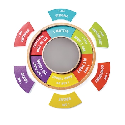 - 12 colorful pieces with positive statements fit around a mirror in the sturdy wooden base