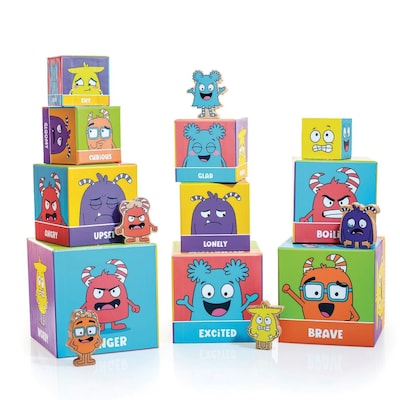 - Learn through play by introducing kids to new emotion words and expressions on each side of the colorful blocks