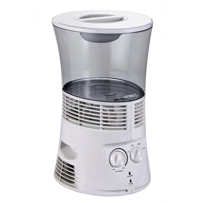 Optimus Cool mist evaporative humidifier in white color has rotary power setting and humidity/power indicator light for convenience.
