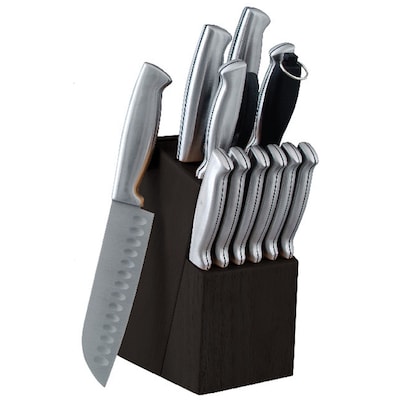 - Includes 6 1/2" santoku knife, 8" carving knife, 5" utility knife, 3 1/2" paring knife, six 4 1/2" steak knives, pair of scissors, sharpening steel, hardwood storage block, 8" bread knife