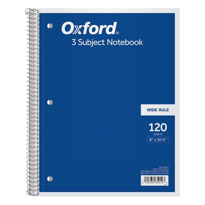 Oxford 1-Subject Notebooks come in bright colors and are 3-hole punched to fit a standard binder. Perforated. Proudly made in the USA. 8" x 10-1/2". Wide ruled, 70 sheets. Blue, green, violet, red or black cover. Colors randomly assigned for each order.