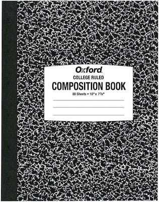 Oxford Composition Books have a classic hardcover format ideal for journaling, lab assignments or notes. Center-sewn sheets keep your pages intact. Black marble cover. 10" x 7-7/8". College ruled, 80 sheets.