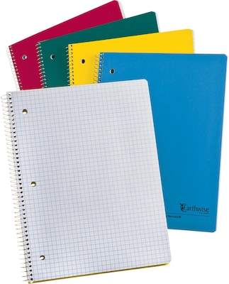 Earthwise by Oxford Recycled 1-Subject Notebooks have paper made from 100% recycled fiber with 50% post-consumer fiber. 3-Hole punched. Proudly made in the USA. 8-1/2" x 11". 4 x 4 graph ruled, 80 sheets. Blue, yellow, red or green cover. Color may vary.
