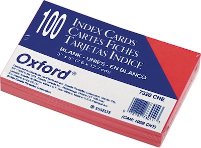 Oxford Unruled index card in cherry color features precision cut edges to obtain uniform size. Acid free card measuring 3" x 5" is essential for students/speakers, sold as 100 cards per pack.