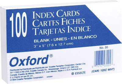 Oxford Index Cards, 3" x 5", White, 100 Cards/Pack (30EE)