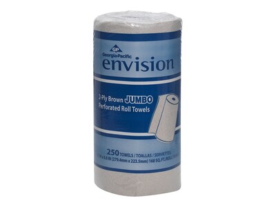 Dry hands and take care of a wide array of messes with these jumbo brown two-ply perforated paper towel rolls. The jumbo size lets you take on a multitude of tasks before having to replace the each roll, and with 12 rolls in each carton, keeping them in stock is easy. These Pacific Blue Basic jumbo brown perforated paper towel rolls feature two-ply construction to deliver the strength needed to prevent rips while offering increased absorption.