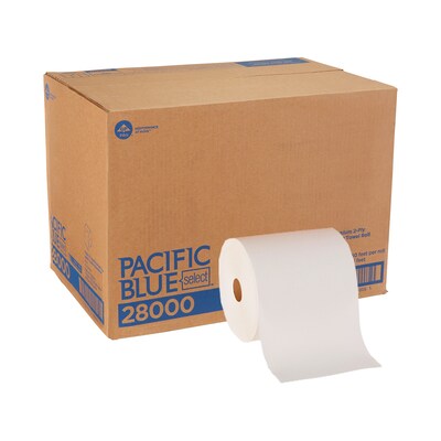 Stock up the supply closet with this case of 12 rolls of Pacific Blue Select Premium white Hardwound two-ply paper towels.