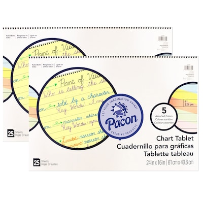 Traditional chart tablets made with pastel colored bond paper. Each tablet contains assorted colors: Yellow, Pink, Salmon, Blue and Green. Sheets 1" ruled the long way, spiral bound and 2-hole punched. Inside front cover features a Cursive alphabet. Recycled and Recyclable. Measures 24" x 16". Includes 25 sheets. Sold as a pack of 2 tablets.
