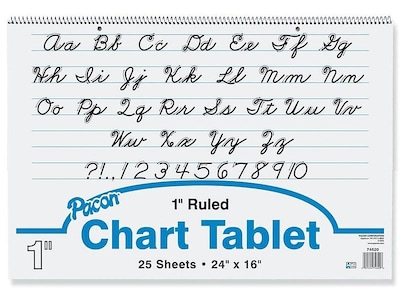 Help students work on their cursive writing skills with this chart tablet. The spiral binding allows for quick page turning, while the printed cursive alphabet makes it easy to refer back to letters. Featuring a two-hole-punched design, this tablet can be hung up easily, ensuring high visibility for the entire class. This Pacon flip chart tablet is made with high-quality sulphite bond paper for enhanced durability and strength.