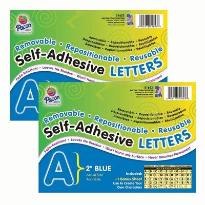 A unique adhesive makes these letters removable, repositionable and reusable. They are easy to use - just "peel and place". They adhere to any clean and dry surface that is smooth or slightly textured (even wood and painted brick walls). Fade-resistant, acid free, leaves no residue and never becomes permanent. Each package contains uppercase letters along with numbers and punctuation marks. Ideal for bulletin boards, signs, posters, presentation boards and much more. The 2" letters have 159 characters per pack. Sold as 2 packs for 318 characters total.