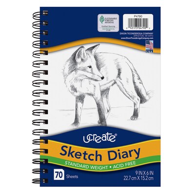 9" x 6" sketch paper diary heavyweight all-purpose white sulphite drawing paper spiral bound on the side for portable sketching.
