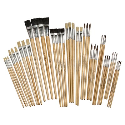 40 scholastic brushes of various sizes, shapes and bristles. Each brush is a factory second that will not affect its performance when in use. Perfect for classrooms on a budget.