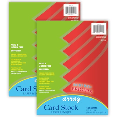 Pacon® Rojo Red Card Stock | Heavyweight 65 lb. acid free cover. Perfect for greeting cards, postcards, report covers, rubber stamping, memory books, flyers, announcements and more. Lignin free, buffered. Laser and inkjet printer compatible. Pacon® Card Stock is acid-free and recyclable. Each pack includes 100 sheets. Each sheet measures 8.5" x 11". Sold as 2 packs for a total of