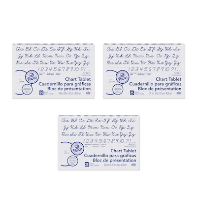 This Chart Tablet features White sulphite bond paper that is spiral bound to stiff covers with a Cursive alphabet printed inside. It is 2-hole punched for easy hanging. Paper is 1" ruled on both sides, and works well for classroom anchor charts, posters and other teaching aids. Measures 24" x 16". Each tablet includes 25 sheets. Sold as a pack of 3 tablets.