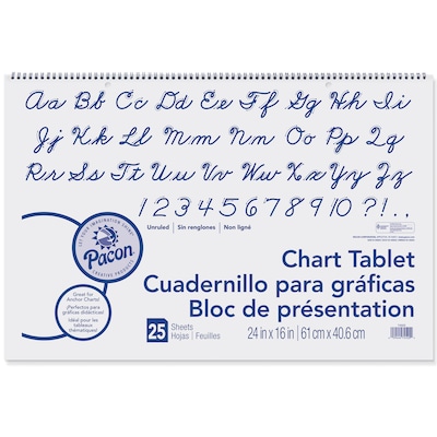 The Pacon Unruled Cursive Chart Tablets come with 2 punch holes to conveniently file in punch folders. You can use them for writing and sketching as they are unruled and clear white. These chart tablets are spiral bound for keeping the sheets together, protected with stiff covers.