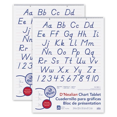 D'Nealian™ Chart Tablet that is 2" ruled on both sides with solid blue headlines, 1" dotted blue midlines, solid red baselines and 1" skip space. Includes a Manuscript cover, with the inside cover showing the alphabet/numerals with directional arrows for modeling when writing in the tablet. Spiral bound White sulphite bond paper is 2-hole punched and ruled the short way. Works great for classroom anchor charts. Recyclable. Measures 24" x 32". Each tablet includes 25 sheets. Sold as a pack of 2 tablets.