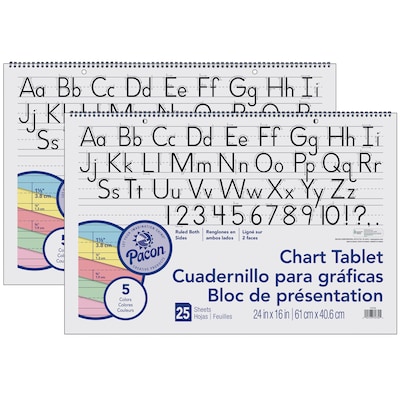 Traditional chart tablets made with pastel colored bond paper. Each tablet contains assorted colors: Yellow, Pink, Salmon, Blue and Green. Sheets 1.5" ruled the long way, spiral bound and 2-hole punched. Includes a 0.75" dotted midline and 0.5" skip space. Recycled and Recyclable. Measures 24" x 16". Each tablet includes 25 sheets. Sold as a pack of 2 tablets.