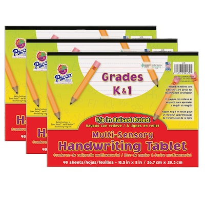 The Multi-Sensory Raised Ruled Paper has raised headlines and baselines which help students stay within the guidelines. It helps teach handwriting through two senses, sight and touch. The headlines are blue and the baselines are red. It has a 5/8" ruling, 5/16" dotted midline and 5/16" skip space and conforms to both D'Nealian® and Zaner-Bloser™ handwriting styles. Tablets contain 40 sheets with a heavy chipboard back and protective retail-friendly cover. Recommended for Grades K and 1. Measures 10-1/2" x 8". Pack of 3 tablets.