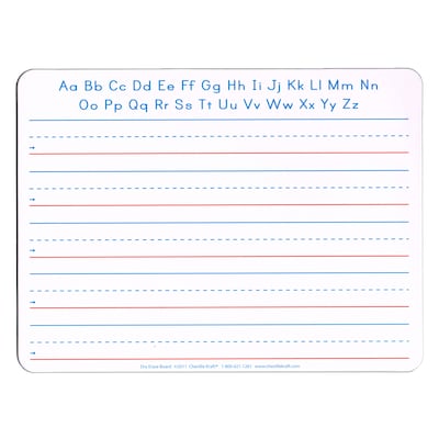 These sturdy melamine whiteboards are perfect for the classroom, home and even travel. Each 9" x 12" board features a 1" ruling, 1/2" dotted midline and 1/2" skip space for writing practice on one side, and a plain whiteboard on the other side. Ruling is blue with red baseline. Uppercase and lowercase alphabet across the top for easy reference for students learning how to write their letters. Each pack includes 10 boards.