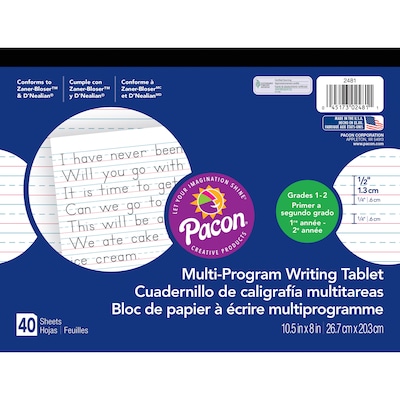 Pacon® Zaner-Bloser™™ "Multi-Program Handwriting Tablet" Paper for grades 1 - 2 has heavy chipboard back, retail-friendly front cover and film wrapped reams. Manuscript ruled white paper includes 40 sheet tablets and 500 sheet reams.