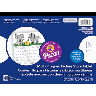 Pacon® Zaner-Bloser™™ "Multi-Program Picture Story Tablet" Paper for grades 1 - 3 has heavy chipboard back, retail-friendly front cover and film wrapped reams. Manuscript ruled white paper includes 40 sheet tablets and 500 sheet reams.