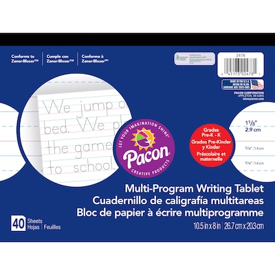 Pacon® Zaner-Bloser™ "Multi-Program Handwriting Tablet" Paper for grade K has heavy chipboard back, retail-friendly front cover and film wrapped reams. Manuscript ruled white paper includes 40 sheets per tablet and 12 tablets per bundle.