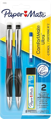 These Paper Mate ComfortMate Ultra Starter Set Mechanical Pencils feature burgundy-colored barrels and built-in eraser tips. Both Paper Mate mechanical pencils in this two-pack use 0.5-mm lead, and each mechanical pencil comes with a specially designed soft comfort grip.