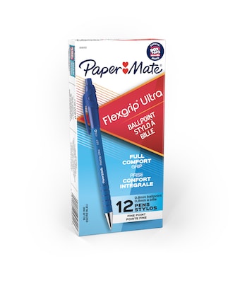 The refillable blue Paper Mate FlexGrip Ultra Recycled Retractable Ballpoint Pen comes in packs of a dozen and features the Lubriglide ink system for smooth writing. This 0.8 mm fine point ballpoint pen has a conical steel tip flange that delivers extra durability. Paper Mate pens have pocket clips and rubberized black grips with blue accents.