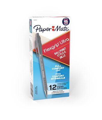 Click open a Paper Mate FlexGrip Ultra retractable ballpoint pen to get writing quickly. Each package has 12 ballpoint pens that are comfortable to grip and made from recycled materials. The 1mm tip features Lubriglide black ink that lets you write with precision, and when you're done, the pen easily retracts. Paper Mate FlexGrip Ultra retractable ballpoint pens have a pocket clip so you can carry your pen with you all day.