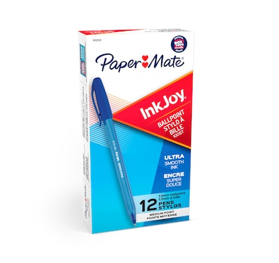 Get precise lines with these medium-point blue ballpoint pens. The built-in plastic clips keep these pens from rolling off desks and make them easy to carry around, and there are 12 in each box, so you can stock up pen supplies easily. These Paper Mate InkJoy 100 ST blue ballpoint pens have caps that snap on tightly to prevent unwanted marking when not in use.