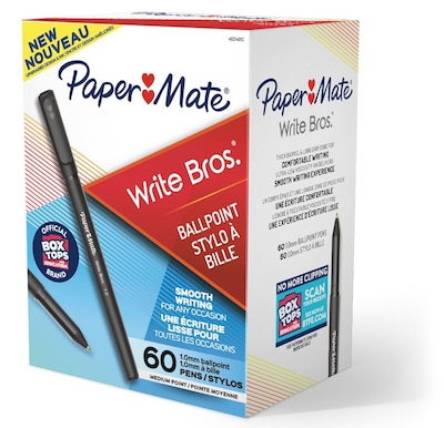 Paper Mate® Write Bros.® ballpoint pens deliver smooth writing for any occasion. The pens’ contemporary design offers an upscale look and feel at affordable prices. The thick barrel and long grip zone bring you comfort while you write. And they’re loaded with ultra-low viscosity ink for a smooth writing experience. Ideal for classrooms, offices, restaurants, and homes, Paper Mate® Write Bros.® ballpoint Pens offer the reliability and versatility to handle all of life's important writing tasks. Black barrel pens with black ink sold as 60 per pack.