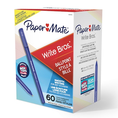 Paper Mate Write Bros medium-point ballpoint stick pens with blue ink make notetaking simpler thanks to lightweight, no-nonsense construction, smooth ink delivery and steady lines. The tops fit securely onto each end of the pen and the clip lets you keep pens handy in your pocket, portfolio or folder.
