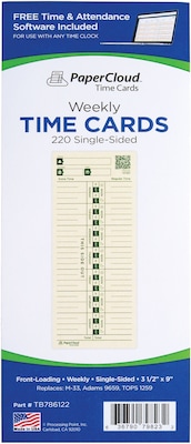 PaperCloud Time Cards clearly capture all employee punches. Perfect for most front-loading time clocks. Free time and attendance software included to dynamically manage data after manually keying in hours from time cards.