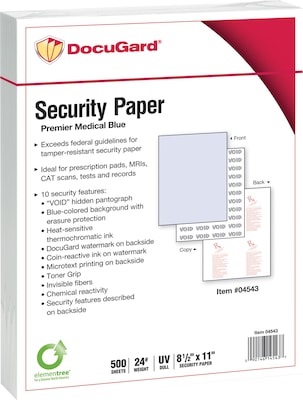 Paris DocuGard Medical security paper in blue color measures 8 1/2" x 11" and has multiple security features to guard it from duplication. Paper creates "void" hidden message when photocopied, sold as 500 per ream.