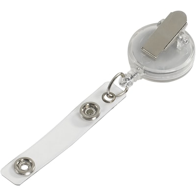 Retractable Clear Lanyard. Displays badges without damaging clothing. Clip holds badges providing easy access for swiping IDs. Translucent badge reel features a steel spring clip to firmly attach to belt. Clear, vinyl snap-on strap.