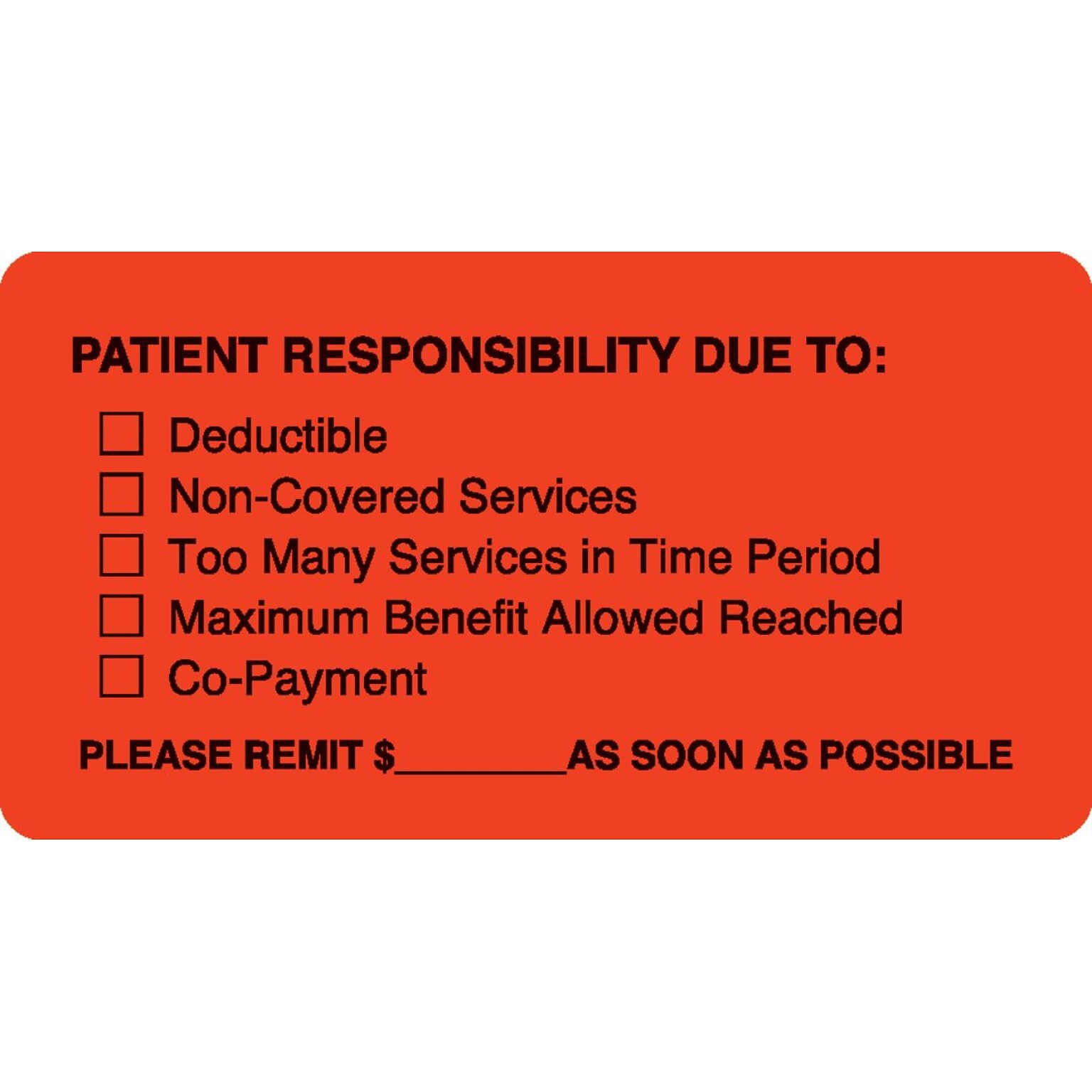 Fluorescent Red "Patient Responsibility Due To:" label helps patients understand the status of their insurance and their responsibility for payment Pressure-sensitive