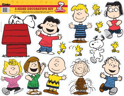 Eureka® Peanuts® classic character two-sided deco kit contains 1 folded sheet of many die cut, full color illustrations or photographs, which are printed on both sides. Deco kit is used to decorate the classroom with Peanuts® characters.