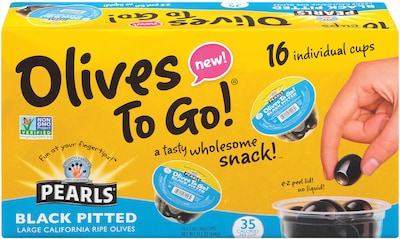- Sixteen individual Pearls Large Black Pitted Olives in To-Go Cups.