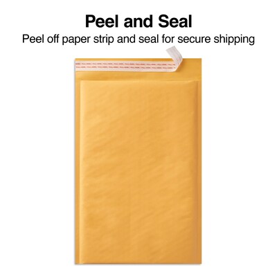 Mail photos, CDs, and DVDs inside these lightweight 6" x 9" bubble mailers. An air-filled bubble lining cushions contents against accidental drops and defends against damage, while the self-seal closure keeps items secure during transit. With a durable kraft paper exterior for added protection and easy marking or labeling, this 25-count carton of Staples 6" x 9" self-seal #0 bubble mailers suits a variety of mailing needs.