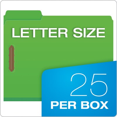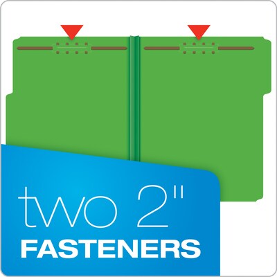 Pendaflex Pressboard Fastener Folders have durable hard covers with two embedded 2" fasteners to keep important papers in place front and back. A 2" expanding spine holds up to 400 sheets. Letter size, dark green. 1/3-Cut tabs in assorted positions. 25 Per box.