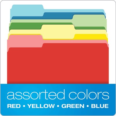 This Pendaflex® Hanging File Folder Combo Kit helps you get organized right away, so you can stay productive at the office or while working from home. Each kit contains 25 letter-sized blue, green, red and yellow hanging folders with 1/5 cut plastic tabs and white paper inserts and 50 letter-sized blue, green, red and yellow file folders. The hanging file folders have 5 positions for labeled tabs and the 1/3 cut color-coordinated file folders come in 3 tab positions for handwritten or sticker labels. Organize homeschool projects and classwork by student or subject.