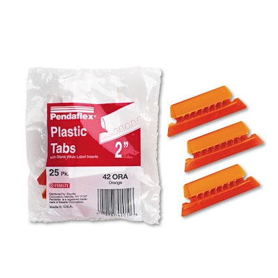 Pendaflex Hanging Folder Tabs allow you to customize your hanging folders. Clear orange plastic tabs (2" wide) with blank white inserts. Stagger the position of your tabs from folder to folder to keep each file heading in view. Tabs are large and angled for easy viewing. For letter and legal-sized hanging folders. 25 Tabs and inserts per pack.
