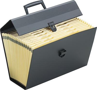 Expanding organizer that's ready for instant filing and easy transport preprinted headings. Latch-front flap with handle delivers briefcase-ease so you can easily take your files with you. Reinforced Tyvek gussets resist tearing.
